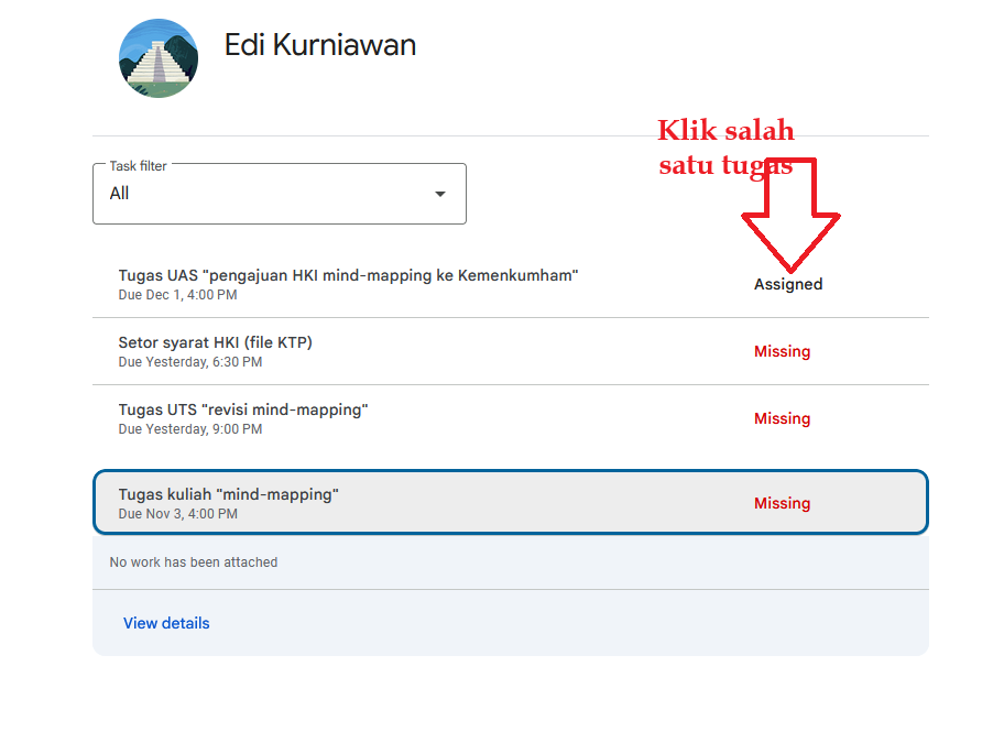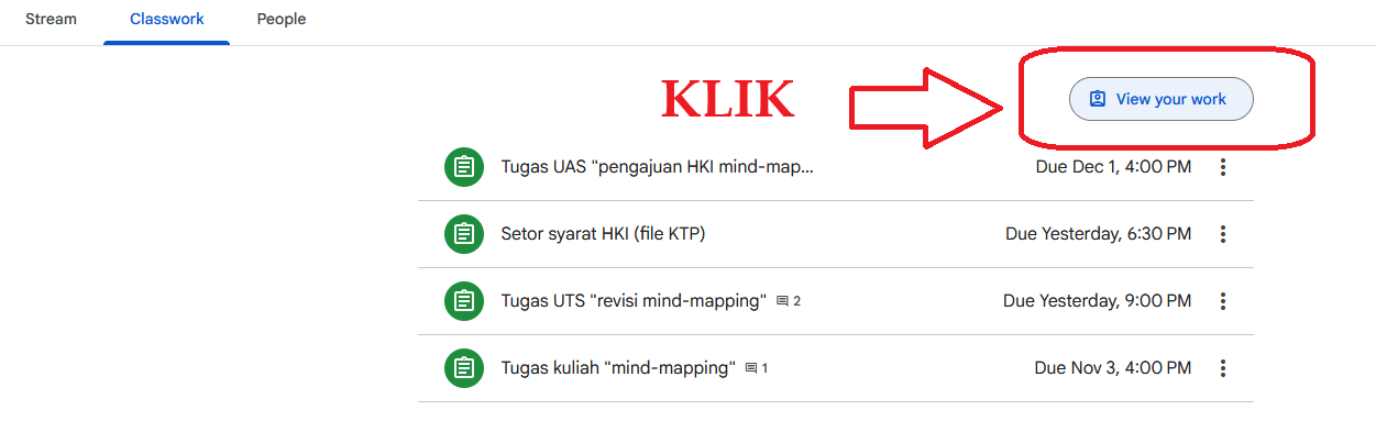 2. Buka klik salah satu kolom tugas yang akan di setor link nya:
