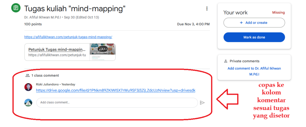 – kirim link file tugas (yg telah di upload di akun GD tadi) di kolom komentar sesuai tugas di GCR, step di bawah ini: